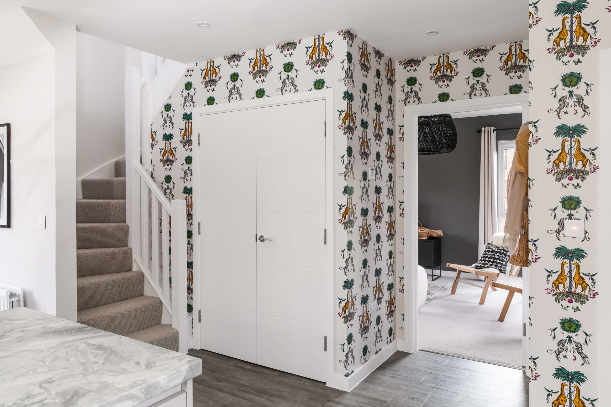 Emma Shipley’s unusual style and admiration for the natural world brings a unique feel to a space. Her wallpaper is used for feature walls in the entrance/hallways and kitchen/breakfast area, to accentuate the home’s personality.